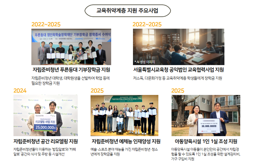 특히 2022년부터는 교육취약계층(저소득 아동·청소년, 자립준비청년 등)이 사회에서 안정적으로 정착할 수 있도록 도움을 주고자 관련 지원을 지속적으로 확대해 나가고 있습니다.
