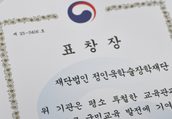 먼저, 정인욱학술장학재단이 저소득층, 다문화가정, 탈북가정 등 교육취약계층을 위해 서울특별시교육청과 협력하여 진행하는 장학금 지원사업을 통해 '국민교육 발전에 기여'한 공로를 인정받았습니다.