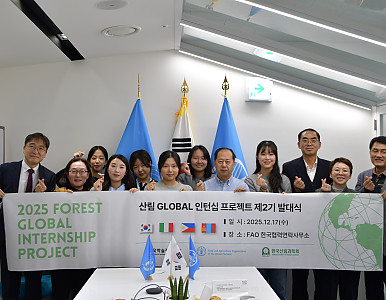 산림과 임업은 더이상 특정 국가 내에서만 고민할 분야가 아닙니다. 기후위기, 산림훼손, 탄소감축 등의 이슈는 국경을 넘어 전 세계가 함께 약속하고 노력하지 않으면 해결할 수 없는 문제들입니다. 그렇기 때문에 산림분야의 국제 교류는 현재도 활발히 이루어지고 있으며 앞으로도 더욱 확대 되어야 합니다.정인욱학술장학재단은 이러한 문제의식에서 출발해 우리나라의 산림인재 육성에서 한걸음 더 나아가 글로벌 인재 육성을 위해 '산림 Global 인턴십 프로젝트'를 시작하게 되었습니다. FAO의 수혜국에서 지원국으로우리는 FAO의 수혜국 신분에서 국제사회의 지원을 밑바탕 삼아 성공적으로 산림복구를 이루어내고 지금은 FAO 지원국으로 거듭난 대표적 성공사례입니다. 포항 영일만 지구 산림녹화 기록물 (출처 : 산림청 누리집) 우리나라는 일본의 수탈과 6.25전쟁을 거쳐오며 심각하게 황폐해진 산림을 되살리는 과정에서 FAO를 통해 국제사회의 도움을 받았고, 그 경험을 토대로 FAO가 지속적으로 참고하는 대표적인 산림 복구 성공 사례로 평가받고 있습니다. 이제 우리는 그 경험을 세계와 나누는 든든한 조력자 역할을 하는 나라가 되었습니다. FAO와의 협력을 통해 국제적 산림문제를 함께 고민하고, 해결방안을 모색하는 위치에 올라온 것입니다. 우리의 산림인재를 국제적 인재로이렇듯 산림분야에서의 우리나라의 국제적 위상은 높은 수준에 이르렀고, 재단은 이런 위상에 걸맞는 인재를 육성하기 위해 국제적 인재 육성 사업을 생각하게 되었습니다. 책이나 인터넷, 영상 등으로 해외를 경험하고 익히는 것을 넘어 직접 가서 그들과 소통하고 그 나라의 문화와 국제기구의 업무 등을 경험할 수 있도록 정인욱학술장학재단은 한국산림과학회, FAO 한국협력연락사무소와 함께 '산림 Global 인턴십 프로젝트'를 기획하고 2024년 1기 선발을 통해 이탈리아 로마와 모잠비크 마푸투에 3명의 인턴을 파견했습니다. 파견된 인턴들은 각자 맡은 바 업무를 성공적으로 마무리하고 국내로 복귀하였습니다.산림 Global 인턴십 프로젝트 2기 선발1기의 성공적인 경험을 바탕으로 2025년 제2기 인턴들의 선발이 진행되었고 이탈리아, 몽골, 감비아, 필리핀 등 4개국 총 5개 직무분야를 대상으로 인턴지원자를 모집하였습니다.2025년 8월부터 9월까지 약 3주간의 모집이 진행되었고 인턴십에 관심을 가진 대학생, 대학원생들의 다양한 문의와 신청이 이어졌습니다. 1차 서류심사에서는 인턴십의 기본이 되는 어학실력과 더불어 지원동기, 자기소개, 진로계획 등을 전반적으로 검토하였습니다. 지원자들은 TOEIC, TOEFL, OPIC 등 공인어학성적은 물론 교환학생, 해외체류 경력 등 다양한 어학능력과 수준을 보유한 실력있는 인재들이었으며 신청서에는 각자의 꿈과 열정이 가득담긴 진정성 있는 지원동기와 자기소개들이 기재되어 있었습니다. 1차 서류심사가 마무리 되고 2차 면접심사가 10월 17일 하루동안 진행되었습니다. 총 20명을 대상으로 오전 10시부터 오후 5시까지 점심시간을 제외하고 쉴틈없이 심사가 이어졌습니다. 최대한 많은 지원자에게 기회를 주기위해 심사위원들은 휴식시간도 반납하고 다소 힘든 일정을 진행하게 되었습니다. 지원자들이 전국에 분포되어 있었기 때문에 면접심사는 온라인 화상면접 방식으로 진행되었습니다. 면접심사는 대부분 영어로 진행되었으며 이 과정에서 서류에 기재된 어학실력과 더불어 해외 인턴에 적합한 인재인지 검증하는 과정이 이어졌습니다. 면접심사를 완료하고 최종 12명의 대상자를 선정하였습니다. 국내 선발과정을 통과한 12명은 FAO 각 나라별 사무소의 현지면접이 진행되었습니다. 각자 지원한 나라의 사무소 담당자들과 면접을 진행하며 본인이 가진 역량과 열정을 보여주기 위해 모두 노력하였습니다. 모든 면접과 선발절차가 마무리 되고 최종적으로 4명의 인턴이 선발되었습니다. 선발된 인턴은 이탈리아 로마 2명, 필리핀 만달루용시티 1명, 몽골 울란바토르 1명으로 모두 2026년 1월부터 11월까지 각 나라로 파견되어 인턴활동을 하게 되었습니다. 국제무대를 앞둔 준비와 결의 : 산림 Global 인턴십 프로젝트 2기 발대식12월 17일, 서울에 위치한 FAO 한국협력연락사무소에서 산림 Global 인턴십 프로젝트 2기 발대식과 사전교육이 이루어졌습니다. 이날 발대식에는 최종 선발된 4명의 인턴 뿐 아니라 정인욱학술장학재단 유용재 사무국장, 한국산림과학회 강규석 부회장, 김지수 사무처장, FAO 한국협력연락사무소 탕 쉥야오 소장, 이나라 부소장, 서울대학교 박현 교수 등이 참석해 인턴들에게 격려와 응원을 보내줬습니다. 발대식에 이어 진행된 사전교육에서는 서울대학교 박현교수의 특강을 통해 우리나라 산림의 과거, 현재, 미래에 대해 다시 한번 이해하고 해외인턴 활동에 필요한 자세와 마음가짐을 알려주었습니다.이어서 FAO 한국협력연락사무소 이나라 부소장이 FAO 전반에 대한 설명과 함께 업무프로세스 등을 알려주며 인턴들의 현장 투입 전 알아야 할 핵심을 짚어 주었습니다.또한 한국산림과학회와 정인욱학술장학재단에서는 인턴들의 지원부분과 출국준비, 현지에서 
