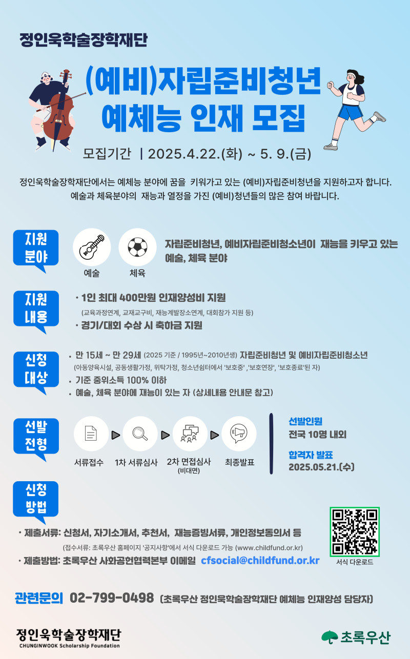(예비)자립준비청년 예체능인재양성 지원사업 모집 공고 2025-07-09 0 288 07.09 13:47 정인욱학술장학재단은 초록우산과 함께 (예비)자립준비청년 예체능 인재양성을 위한 지원사업을 운영합니다. 신청 및 접수는 초록우산을 통해 진행되오니, 자세한 신청방법은 첨부 안내문을 필히 확인하시기 바랍니다.