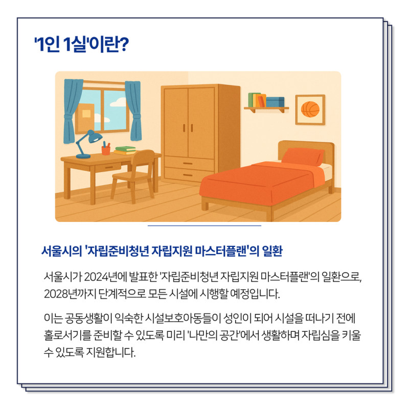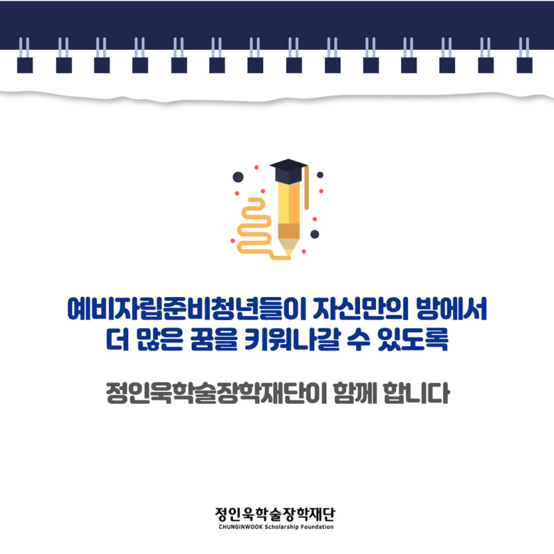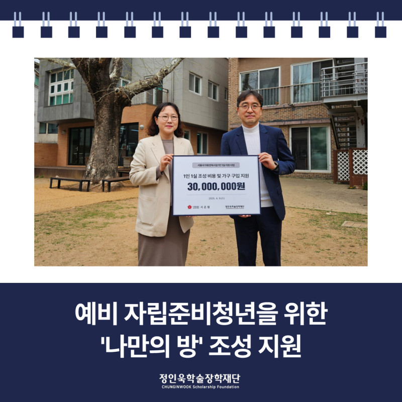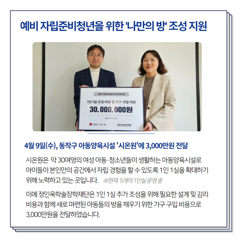 [카드뉴스]예비 자립준비청년을 위한 '나만의 방' 조성 지원 최고관리자 2025-07-09 최고관리자 0 397 07.09 15:28 정인욱학술장학재단은 서울시 아동양육시설 1인 1실 지원 사업의 일환으로, 지난 4월 9일에 아동양육시설 '시온원'을 방문하여 1인 1실 조성을 위한 설계 및 감리비, 가구 구입비 3,000만원을 전달하였습니다. 앞으로 아동양육시설에서 아이들이 본인만의 공간에서 자립 경험을 할 수 있기를 응원하겠습니다.